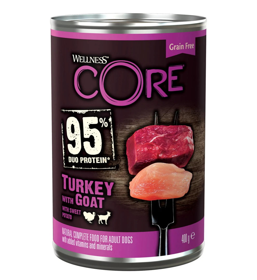 Wellness CORE hondenvoer 95% Turkey/goat is een heerlijke, graanvrije maaltijd met hoog vleesgehalte voor volwassen honden van alle rassen.