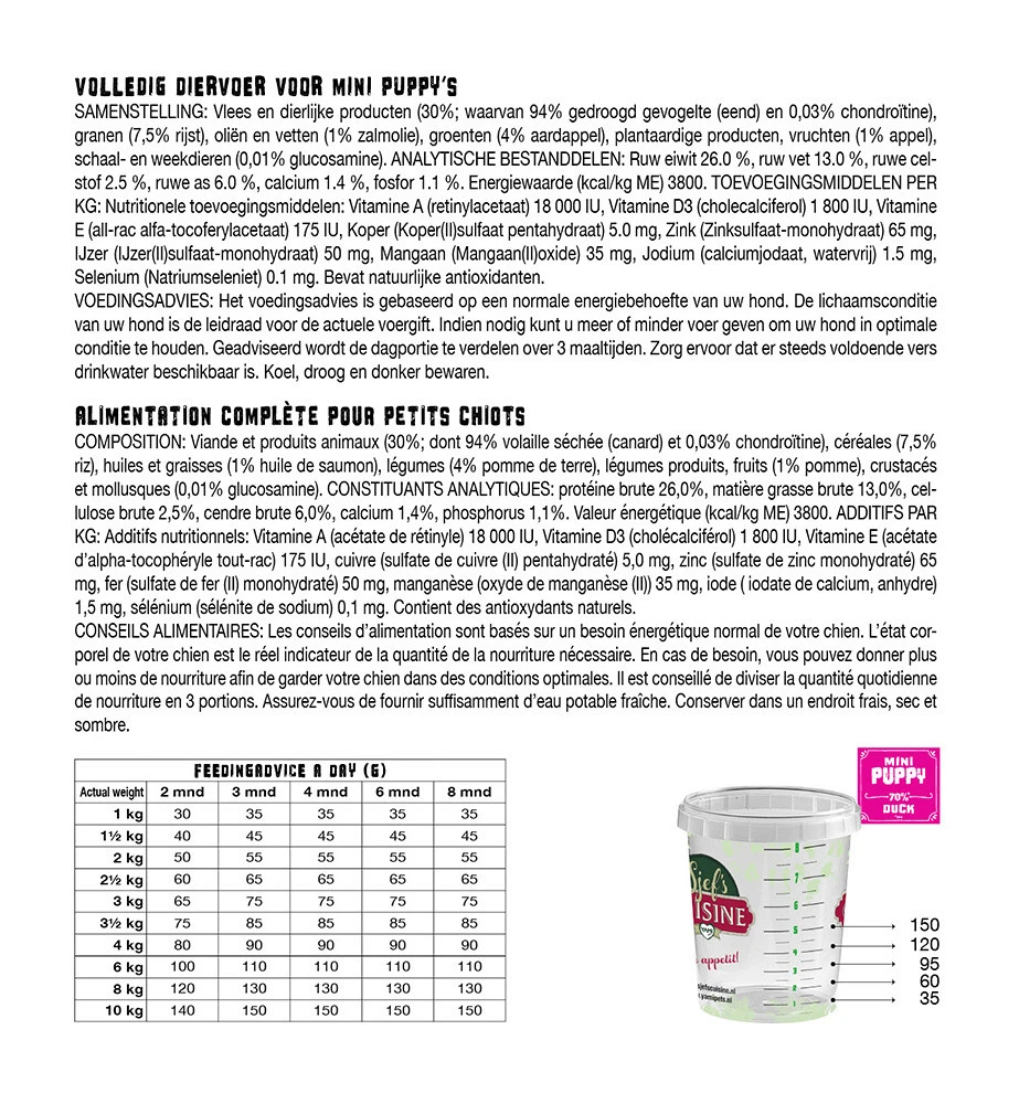 Yamipets Sjef’s Cuisine hondenvoer Mini Puppy is speciaal voor pups van de kleinste hondenrassen. De mini brokjes zijn afgestemd op de voedingsbehoefte van kleine pups van 4 weken tot 8 maanden. Jonge honden van kleinere rassen verbruiken relatief meer energie dan rassen van grotere honden en groeien vooral in de eerste levensmaanden heel snel. De Puppy Mini heeft daarom een hoger vet- en eiwitpercentage.